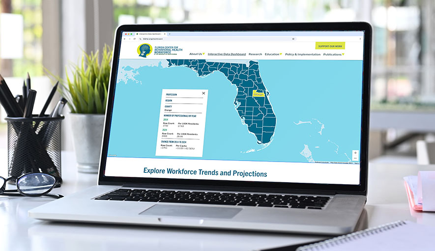 Appleton partnered with USF FCBHW to develop a custom website and Interactive Data Dashboard that visualizes real-time insights into Florida’s behavioral health workforce. The platform allows users to filter data by profession, county and timeframe, creating a clear and customizable view of current workforce trends.