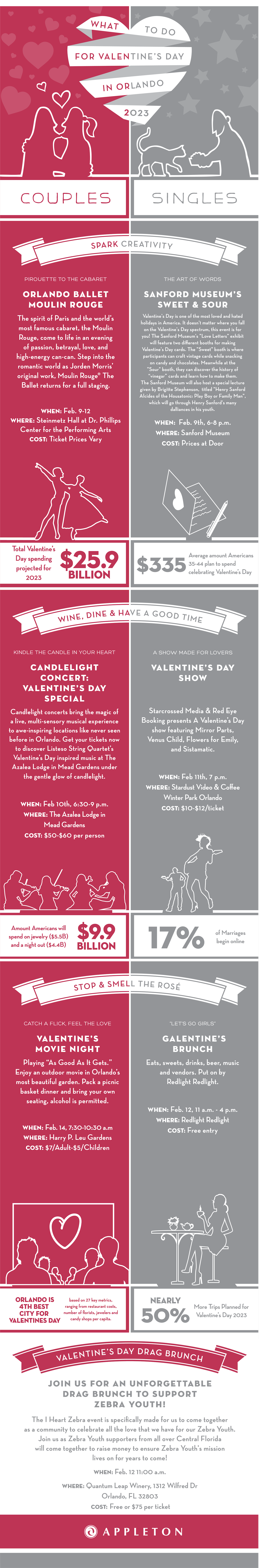 Looking for the best things to do for Valentine’s Day in Orlando in 2023? Whether you’re single or a couple, we’ve got you covered. Spend your Valentine’s Day with the person, or people, you love! The Orlando area is filled with adventurous, relaxing and delicious events this year that you won’t want to miss. Check out our annual Valentine’s Day infographic to find out what event speaks to your heart.